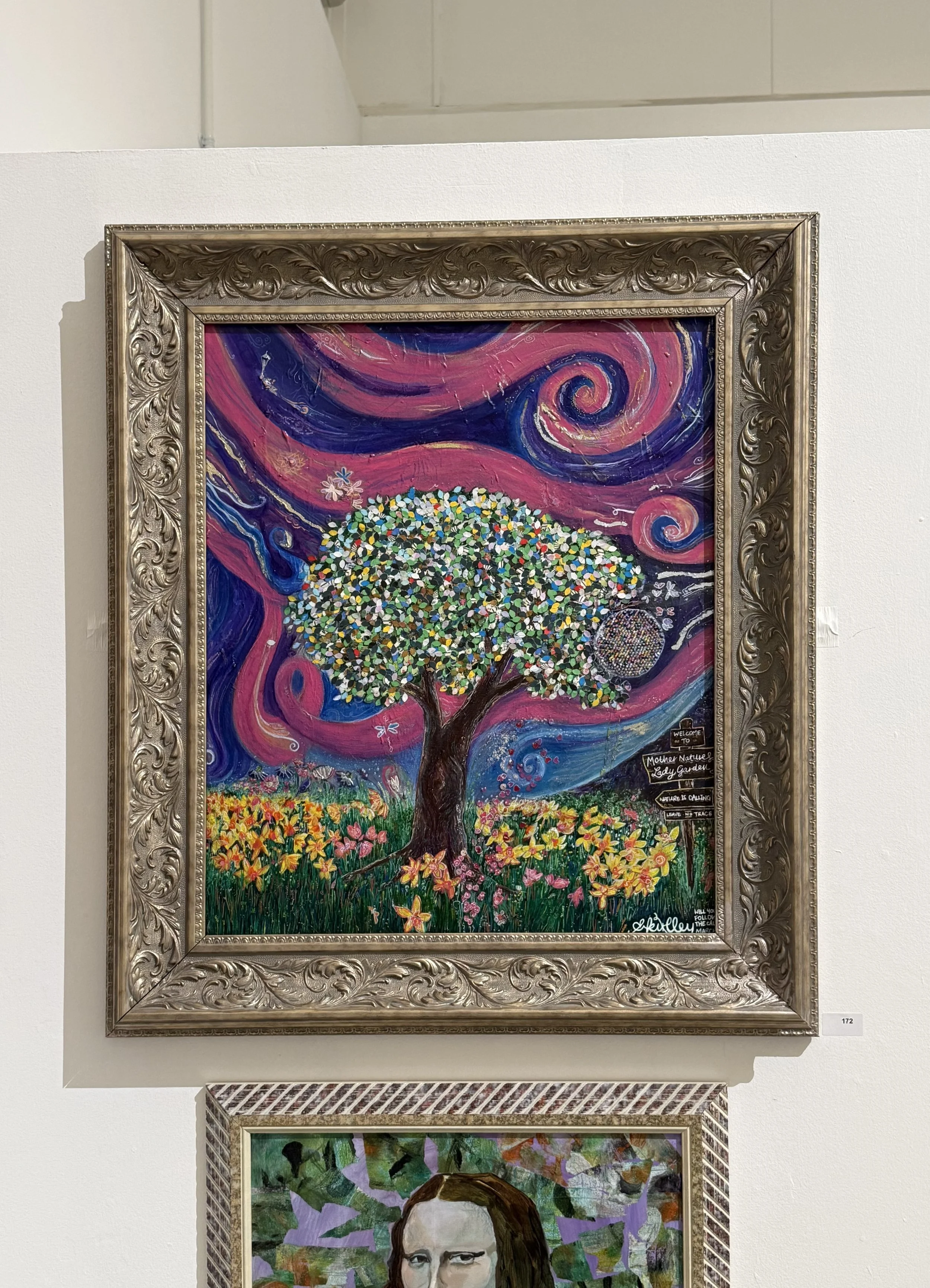 Yonic shapes, swirling skies, and quiet celebration weave through the branches. The piece is playful, personal, and a little bit cheeky.